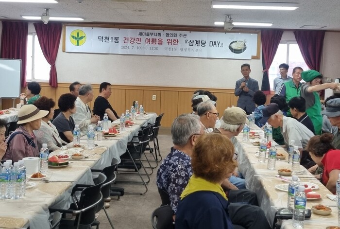 이번 행사는 어르신들이 건강한 여름을 보내시라는 의미에서 마련됐으며, 덕천1동 새마을부녀회에서 정성껏 끓인 삼계탕과 과일, 떡 등 다과를 준비해 어르신들에게 대접하는 뜻깊은 시간을 가졌다.