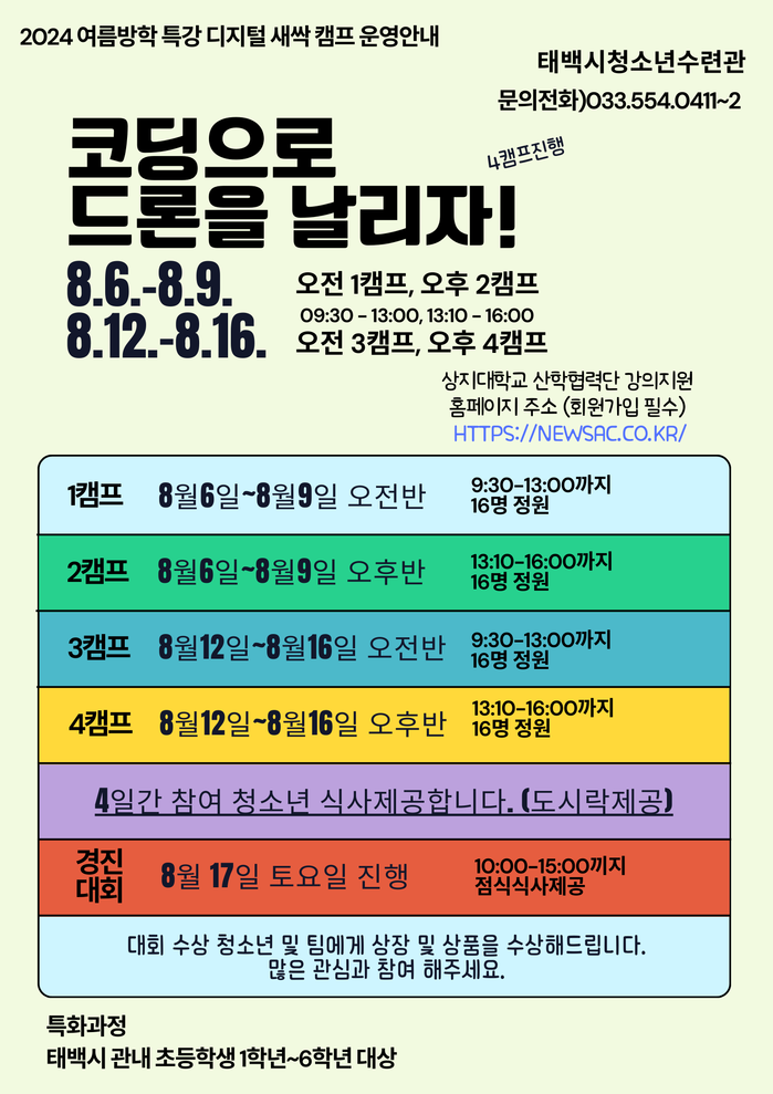 캠프는 오전반(9:30~13:00), 오후반(13:10~16:00)로 나누어 진행되며, 6일부터 9일까지는 태백시청소년수련관에서, 12일부터 14일, 16일까지는 상장청소년문화의집에서 진행한다.
