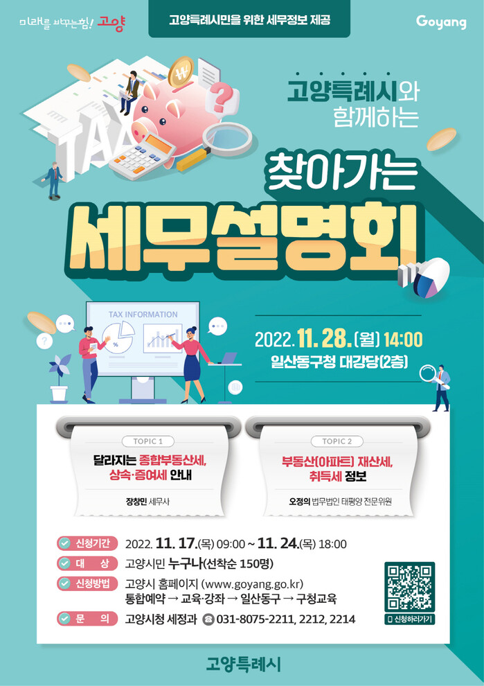 [로컬세계 = 이영원 기자]경기 고양특례시가 오는 28일 오후 2시 일산동구청 대강당에서 ‘고양특례시와 함께하는 찾아가는 세무설명회’를 개최한다.