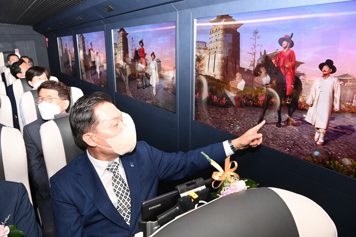 ▲ 지난해 7월27일 스마트관광도시 선포식에서 XR버스를 체험하고 있는 이재준 수원특례시장. |
