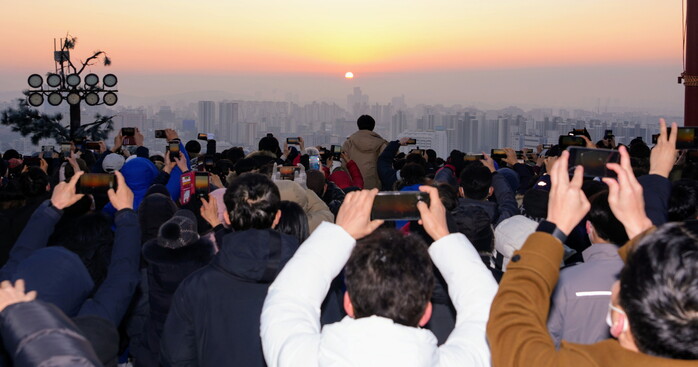 ▲ 계묘년 새해를 맞은 2023년 1월1일 수원시의 중심부에 위치한 팔달산 서장대에서 시민들이 일출맞이를 하고 있다. 수원시 제공 |