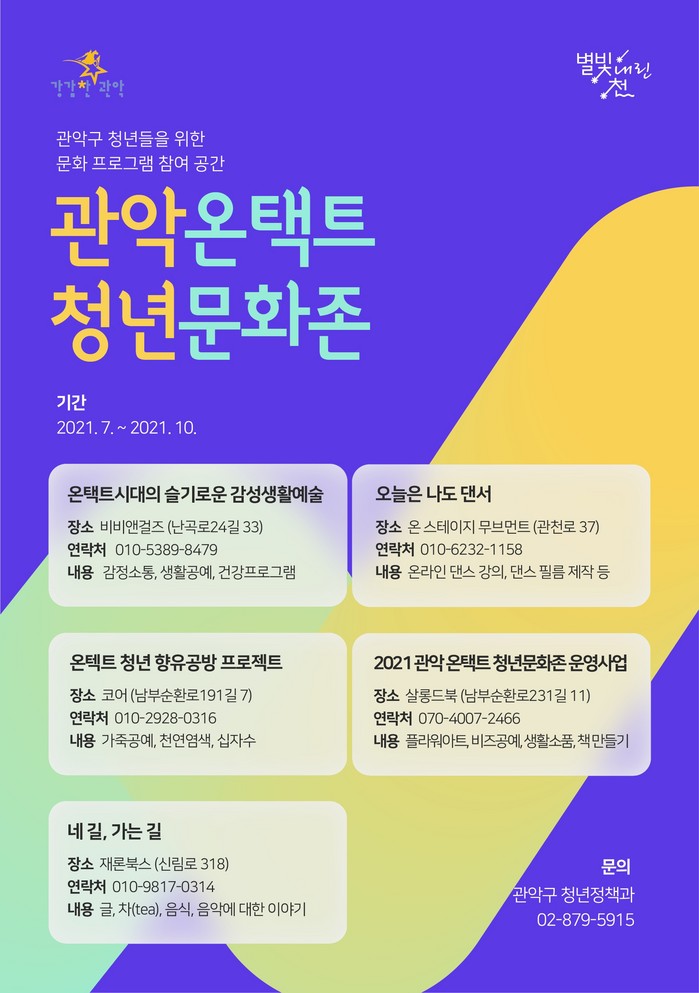 [로컬세계 임종환 기자]서울 관악구는 오는 7월부터 10월까지 ‘온택트(Ontact) 청년문화존’을 운영, 지역 청년들이 자유롭게 참여 가능한 다양한 문화 프로그램을 제공한다고 29일 밝혔다.