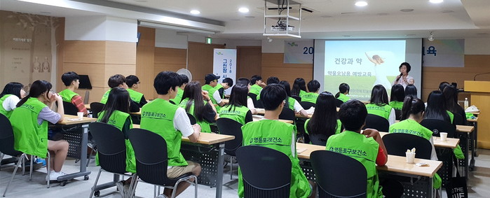 ▲지난해 8월 6일 보건소에서 진행된 그린팜 시티 의약품 안전교육에서 청소년들이 강의를 듣고 있다.(영등포구 제공) |