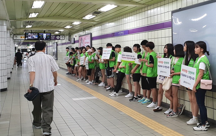 ▲지난해 8월 7일 그린팜시티 의약품 안전교육을 받은 청소년들이 영등포구청역 2·5호선 환승구간에서 캠페인을 펼치고 있다. |