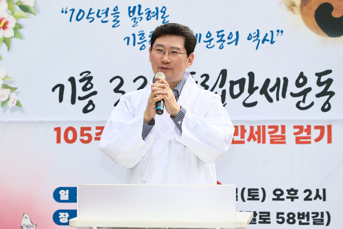 이 시장은 “이곳은 105년 전 우리 선열들이 민족의 깨어있음을 증명한 자리”라며 “삼일절 노래의 ‘오늘은 우리의 의요, 생명이요, 교훈이다’라는 가사처럼 조선인이 자주민임을 밝힌 것이 바로 옳음의 의였고, 우리 민족의 생명이었고, 전 세계의 우리 후배들에게 큰 교훈으로 남겨줬다”고 말했다.
