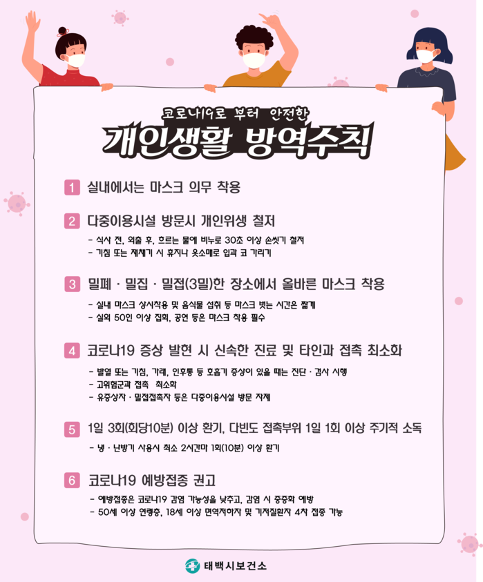 일상생활 방역수칙은 ▲ 모든 실내는 마스크 의무 착용 ▲ 손씻기 및 손위생 관리 철저 ▲ 유증상자는 신속한 진료 및 타인과 접촉 최소화 하기 ▲ 다빈도 접촉 부위 1일 1회 이상 소독 ▲ 코로나19 예방접종 권고(50세 이상 연령층, 18세 이상 면역저하자 및 기저질환자 4차 접종 가능)등이다.