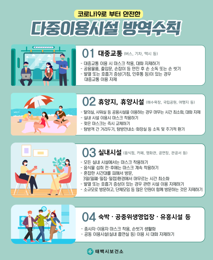 다중이용시설 내 방역수칙은 ▲ 실내 모임시 최소 1m 간격 유지 ▲ 냉방기기 가동 시 최소 2시간마다 1회 이상 환기 ▲ 사적 모임의 규모와 시간을 가능한 최소화 하기 등이다.