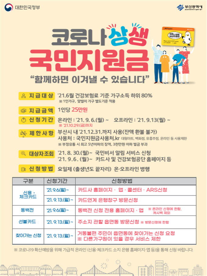 코로나 상생 국민지원금(이하 국민지원금)은 코로나19로 인해 소득이 감소한 피해 계층의 생활안전망 확보를 위해 소득 하위 80% 가구를 대상으로 개인별 25만 원을 지원하는 사업이다. 12월 27일 기준, 부산지역 지급대상자 289만 3천 명 중 288만 1천여 명이 수령을 완료하여 지급률은 99.6%에 달한다.