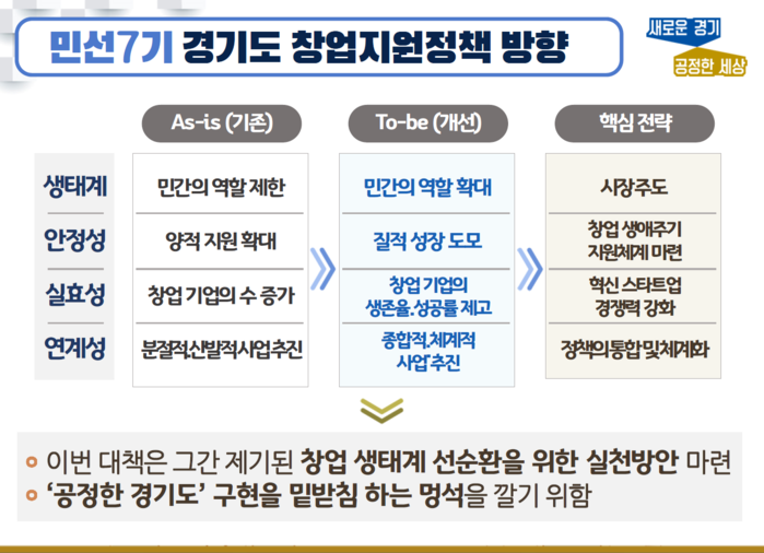최계동 혁신산업정책관은 17일 경기도청 북부청사에서 열린 기자회견에서 “경기도는 국내 최다 창업기업 22.6%(약 45만 개)가 위치해 있고, 기술기반 창업기업 3년 생존율이 53.1%로 전국 49.9% 보다 높은 명실상부 국가경제의 지렛대이지만, 창업기업의 지속가능한 경영활동 보장 등 보완·발전시킬 부분이 아직 많다”며 “창업 초기 보육에서부터 투자연계, 글로벌 창업까지 보다 체계적인 창업지원 방안이 필요하다”고 이번 대책의 추진배경을 설명했다.