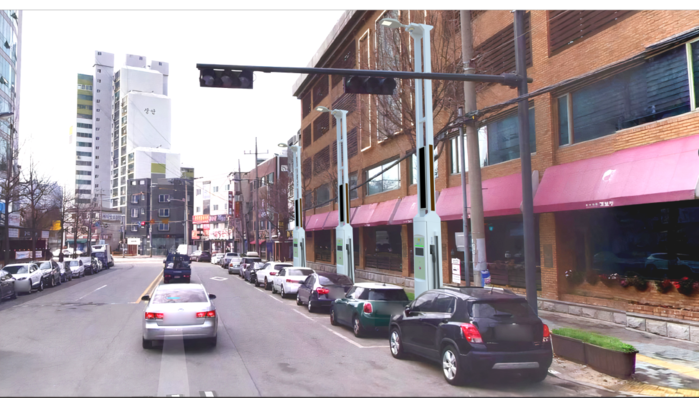 | ▲가로등형 전기차 급속충전기 예상도.(※실제 설치 위치는 예상도 배경과 다름.)/ 수원시 제공 |