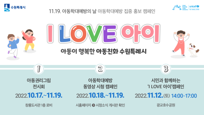 [로컬세계=김병민 기자]경기 수원시가 아동학대예방의 날(11월 19일)을 맞아 아동의 소중함을 알리는 캠페인을 전개한다.