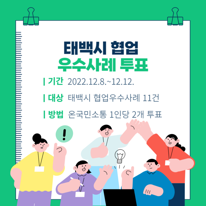 국민투표는 오는 8일부터 12일까지 온 국민소통 홈페이지 국민심사 항목에서 ‘태백시 협업 우수사례 투표’를 선택해 참여할 수 있다. 우수사례로 추천된 총 11건 중 2건을 선택해 투표하면 된다