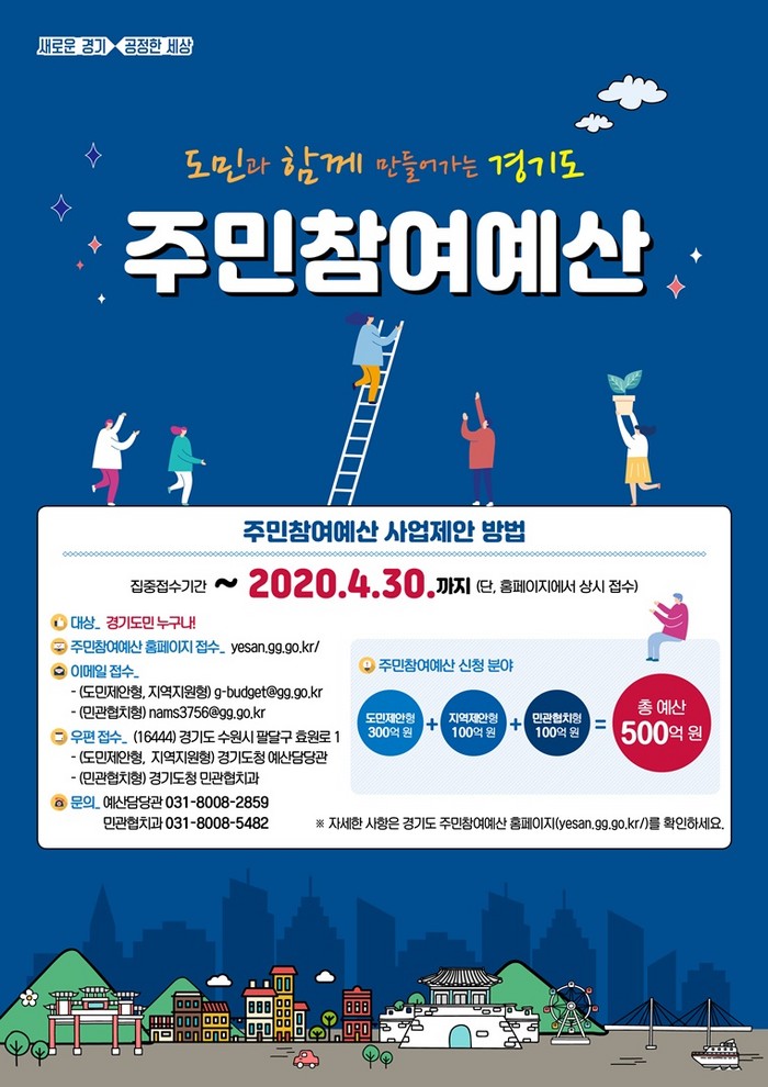 [로컬세계 고기훈 기자]경기도가 500억원 규모의 주민참여예산 도민제안사업 공모기간을 당초 이달 10일에서 30일까지 연장한다고 5일 밝혔다.