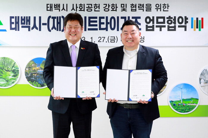 [로컬세계=박상진 기자]강원 태백시(시장 이상호)는 지난 27일 태백시 사회공헌 강화 및 협력을 위해 재단법인 화이트타이거즈(이사장 이종선)와 업무협약을 맺었다.