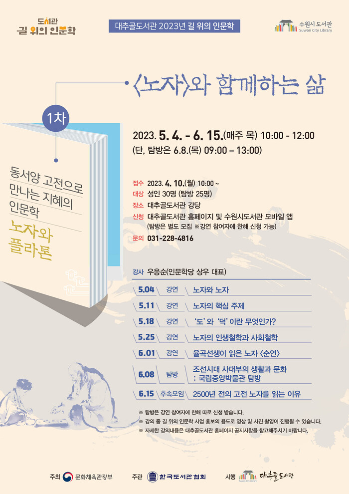 [로컬세계=김병민 기자]경기 수원시 대추골도서관이 2023년 길 위의 인문학 ‘노자와 플라톤 : 1차 노자와 함께하는 삶’의 수강생을 선착순으로 30명 모집한다.