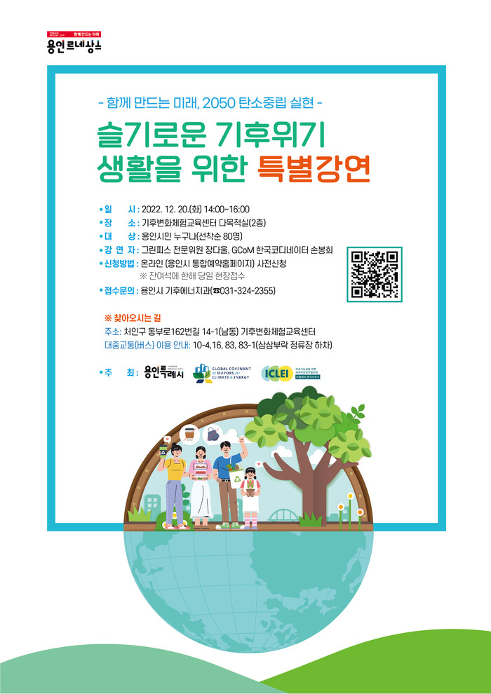 [로컬세계=김병민 기자]경기 용인특례시(시장 이상일)가 기후 위기에 대한 시민 공감대를 형성하고 실천방안을 모색하기 위해 탄소중립을 주제로 특강을 연다.