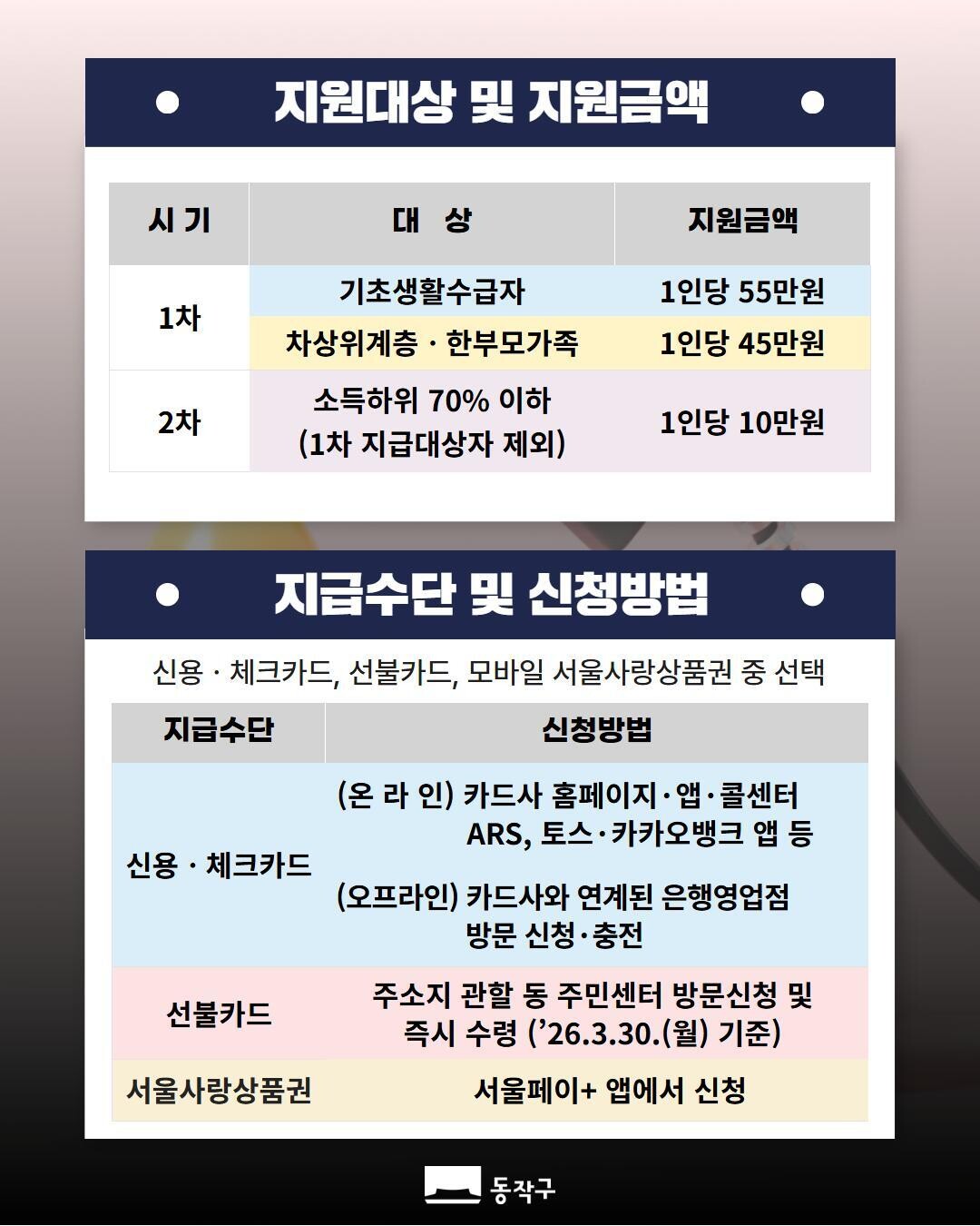 지원금은 신용·체크카드, 모바일 서울사랑상품권, 선불카드 중 선택해 받을 수 있으며, 카드사 홈페이지·앱 또는 은행 방문 등을 통해 신청 가능하다. 첫 주에는 출생연도 끝자리에 따른 요일제가 적용된다.