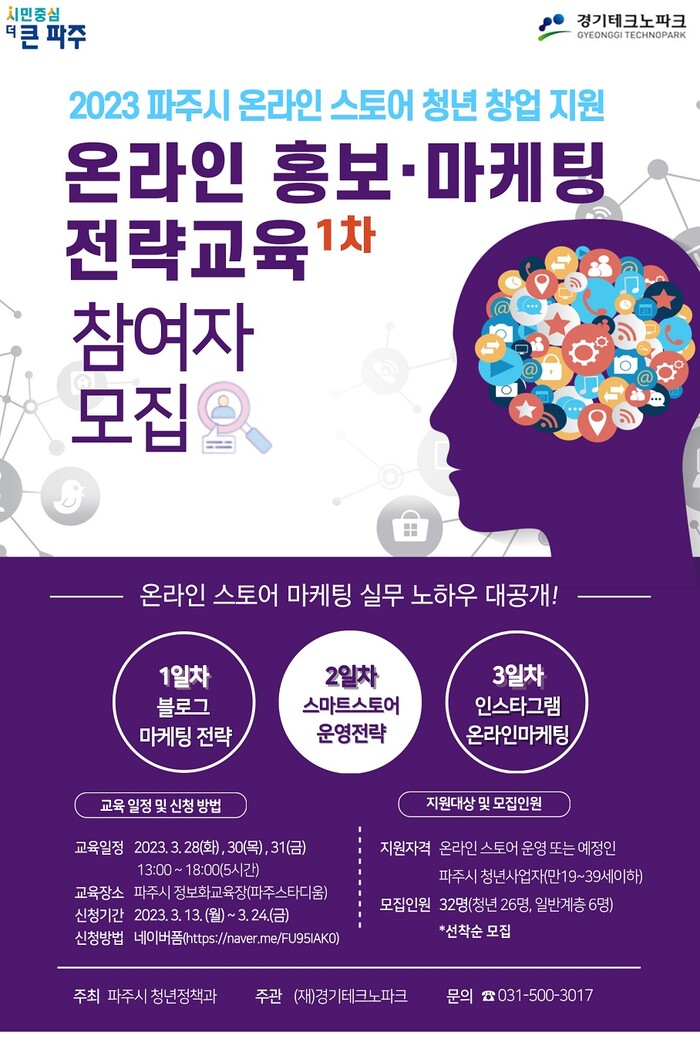 [로컬세계 = 이영원 기자]경기 파주시는 청년 창업자들의 온라인 마케팅 역량 강화를 위한 홍보‧마케팅 전략교육(1차) 참여자 32명을 오는 24일까지 모집한다.