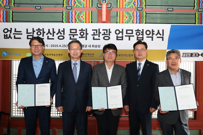 이날 협약은 상당수 장애인들이 세계유산인 남한산성을 방문하고자 해도 지리적으로 험난한 코스가 많아 이를 향유할 수 없음을 감안, 장애인들이 전동카트에 탑승해 문화해설과 함께 남한산성 관광을 즐길 수 있도록 하기 위해 마련됐다.