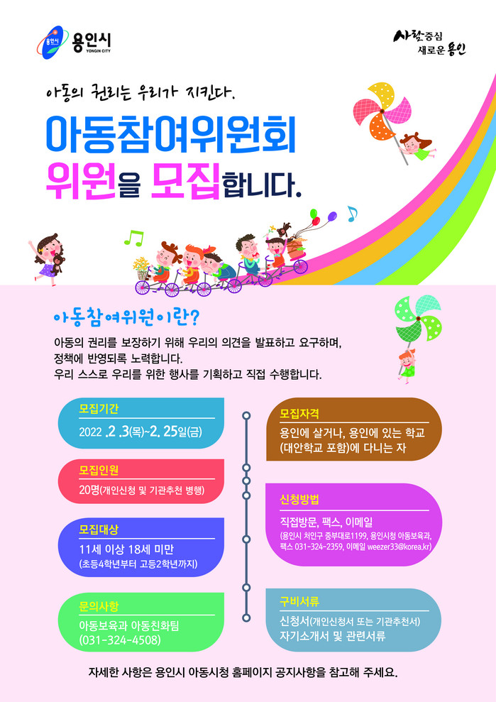 [로컬세계 김병민 기자]경기 용인시가 3일부터 아동정책을 함께 만들어 나갈 ‘제4기 아동참여위원회’ 위원을 모집한다고 2일 밝혔다.