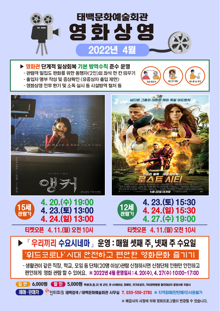 이밖에도 태백문화예술회관에서는 ‘우리끼리 수요시네마’를 매월 셋째 주, 넷째 주 수요일 오전 10시부터 오후 5시까지 운영한다.
