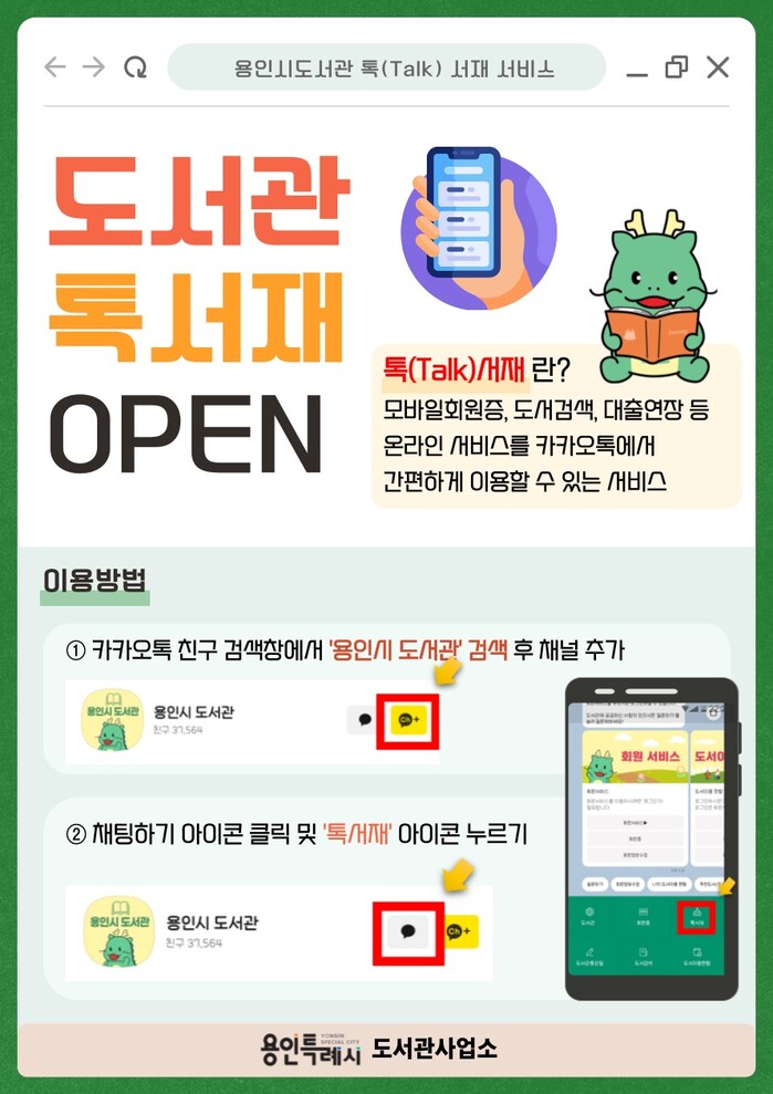 [로컬세계=김병민 기자]경기 용인특례시는 이달부터 모바일 메신저 카카오톡을 기반으로 한 ‘톡(Talk) 서재 서비스’를 시작한다고 2일 밝혔다.