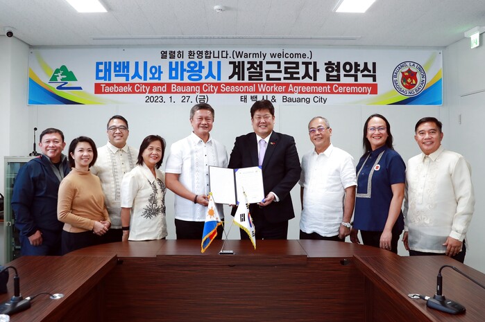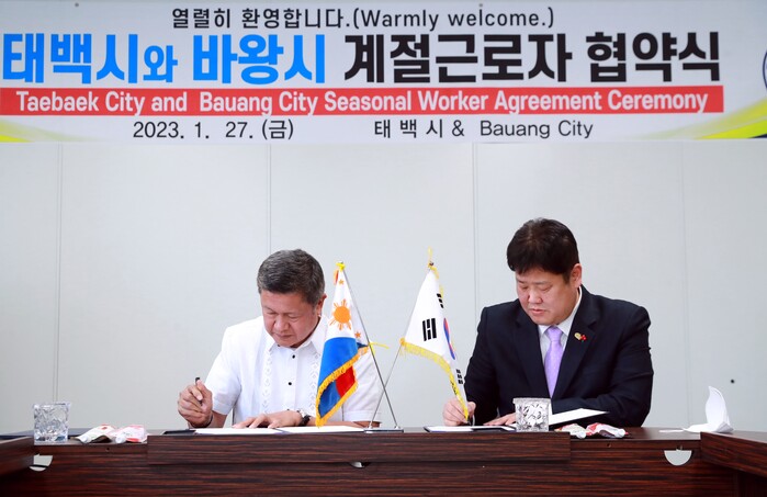 [로컬세계=박상진 기자]강원 태백시(시장 이상호)는 필리핀 바왕시(시장 마르틴 드 구즈만 3세)와 지난 27일 태백시농업기술센터 소회의실에서 외국인 계절근로자 유치를 위한 협약식을 체결했다고 30일 밝혔다.