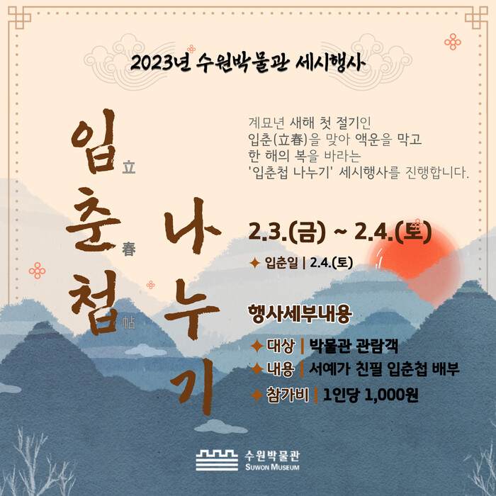 수원박물관 관계자는 “계묘년 새해 첫 절기인 입춘을 맞아 전통 세시풍속을 시민들과 함께하기 위해 입춘첩 나누기 행사를 마련했다”며 “앞으로도 수원의 역사와 우리 전통문화를 널리 알리기 위해 노력하겠다”고 말했다.