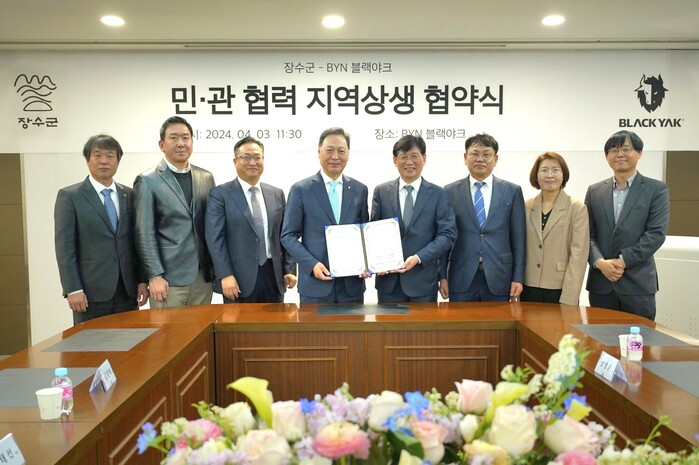 3일 오전 서울 서초구 블랙야크 양재사옥에서 진행된 협약식에는 강태선 BYN블랙야크그룹 회장과 최훈식 장수군수 등 관계자들이 참석했다.