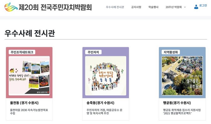 행정안전부와 대통령소속 자치분권위원회 등이 주관한 제20회 전국주민자치박람회는 지난달 29일 온라인으로 진행됐다. 1차 서류심사, 2차 인터뷰 심사를 거쳐 70개 우수사례를 선정했고, 온라인전시관 심사와 우수사례 발표로 수상동을 선정했다.