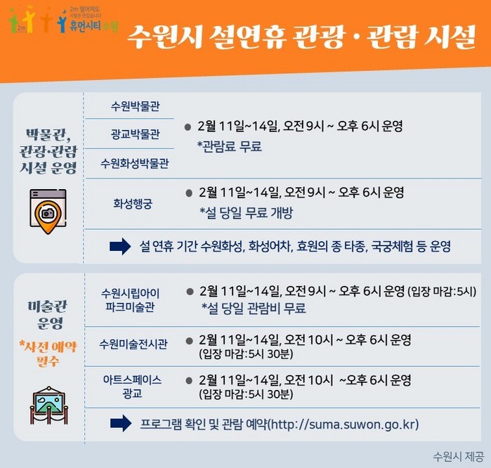 수원박물관에서는 특별기획전 ‘서풍만리-조선서예 500년’에서 영조와 정조의 어필, 등 조선 서예 유물 106점을 만날 수 있다. 수원광교박물관에서는 ‘신축년, 반갑소’에서 소와 관련된 민속품, 설화, 속담 등의 이미지를 볼 수 있다. 수원화성박물관에서는 ‘융건릉의 원찰 수원 화산 용주사’를 통해 용주사 관련 유물 80점이 기다리고 있다. 3곳 모두 오전 9시부터 오후 8시까지 운영되며 연휴 중에는 무료 개방된다. 대신 관람 인원은 30% 이하로 동일 시간대 40명으로 제한되며, 해설과 교육 및 체험프로그램은 운영하지 않는다.