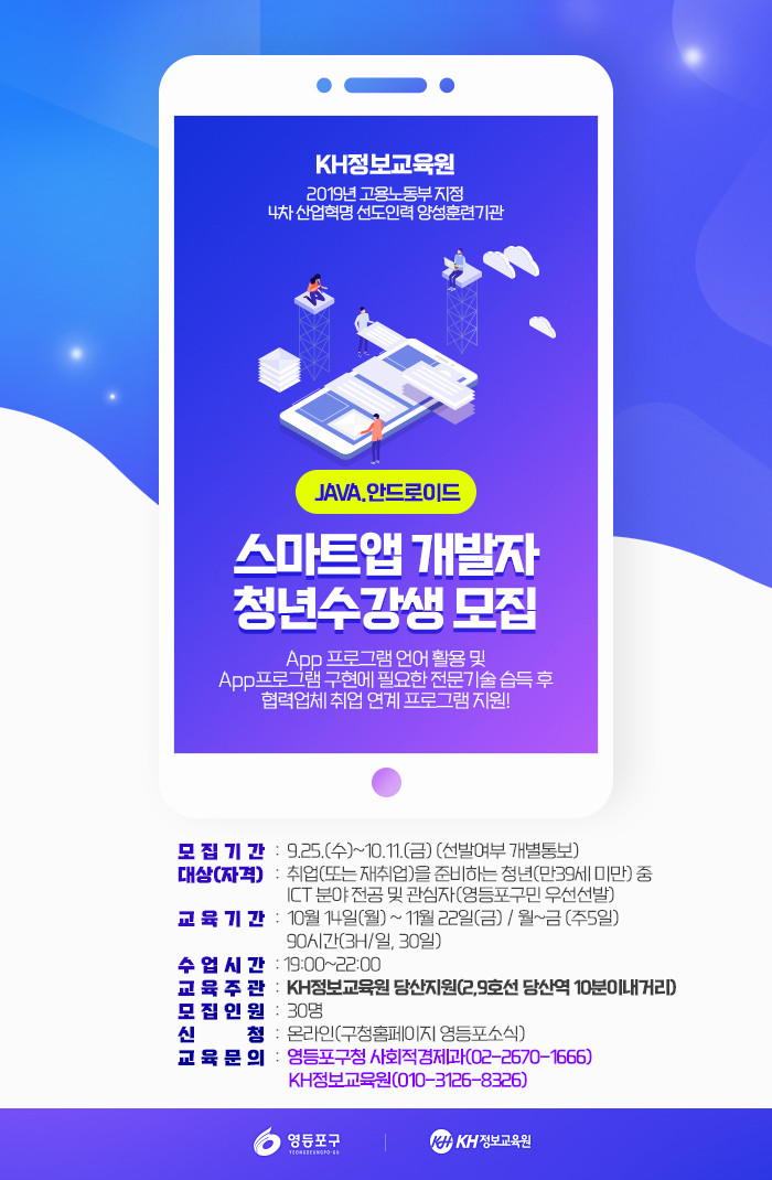 [로컬세계 임종환 기자]서울 영등포구가 ‘안드로이드 앱 개발자 양성과정’을 내달 14일부터 11월 22일까지 6주 과정을 운영하며 청년 취업에 앞장선다.