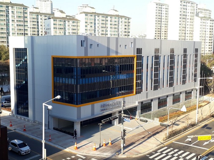 수원시가 전국 기초지방자치단체 최초로 건립한 녹색교통회관은 건축 면적 4908㎡, 지하 1층·지상 3층 규모다.