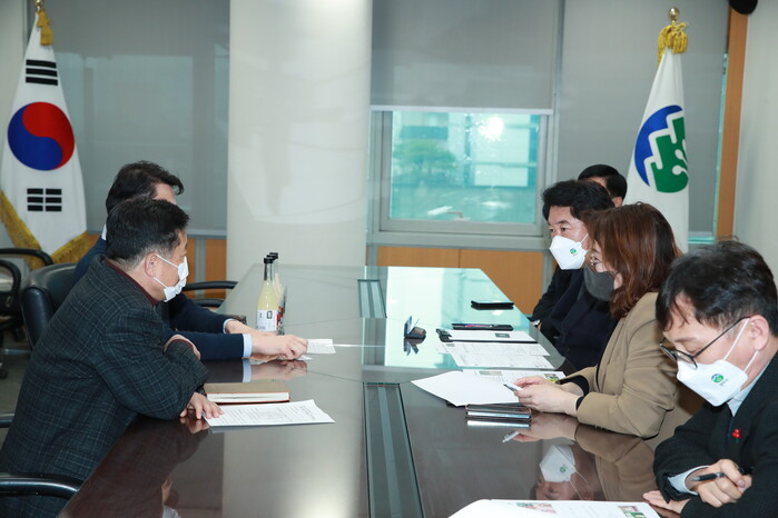 ▲ 막걸리 샘플을 보며 사업추진 경과를 경청하는 박준희 구청장. 관악구 제공 |