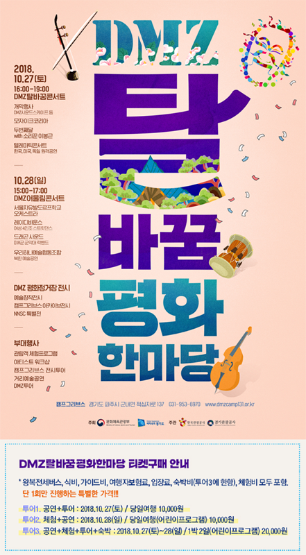 또 캠프그리브스 내 곳곳에서는 지난 6월 개막해 올 10월말까지 진행되는 ‘DMZ 평화정거장 거리공연 프로젝트’에 맞춰 퓨전국악, 마술, 스트릿 댄스, 거리극, 버스킹, 퍼포먼스, 예술창작전시 등 다채로운 장르의 문화·예술 프로그램들도 펼쳐진다.