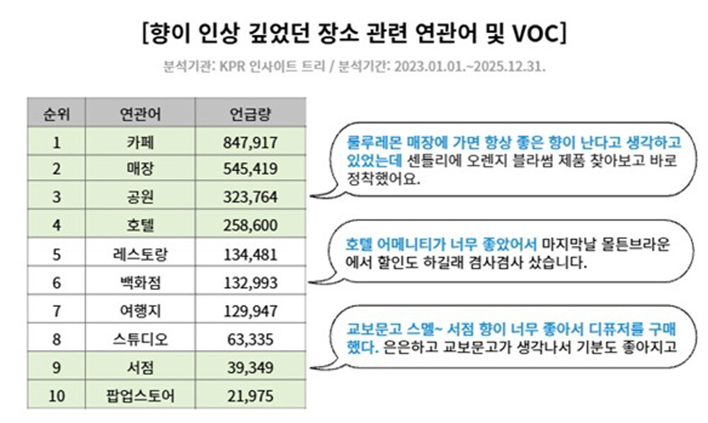 종합커뮤니케이션그룹 KPR(사장 김강진) 부설 KPR 인사이트 연구소는 온라인상 700만 건의 빅데이터를 분석한 결과 향기에 대한 언급량이 2025년에 255만 5천 건으로 최근 3년 사이 20% 이상 증가했다고 밝혔다.