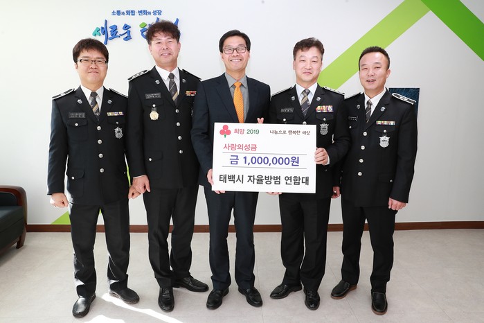 태백시자율방범연합대(대장 문윤기)가 지난 28일 태백시청을 방문, 이웃돕기 성금 1백만원을 기탁했다.