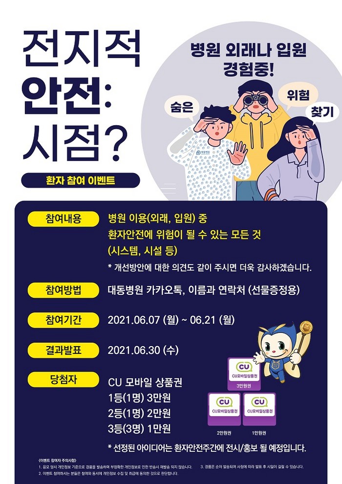 이번 이벤트는 환자뿐만 아니라 직원과 일반 방문객들이 자유롭게 참여할 수 있도록 온라인으로 진행되며 외래 진료와 입원 등 대동병원을 이용하면서 발견한 환자 안전의 위험 요인들과 개선할 수 있는 아이디어 등을 대동병원 공식 카카오채널을 통해 접수하면 응모가 완료된다. 결과발표는 6월 30일이다.