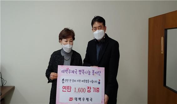 [로컬세계 박상진 기자]강원 태백시는 지난 9일 태백우체국에서 지역의 저소득층 이웃을 위해 써달라며 연탄 1600장과 성금 113만원을 지정 기탁했다고 14일 밝혔다.
