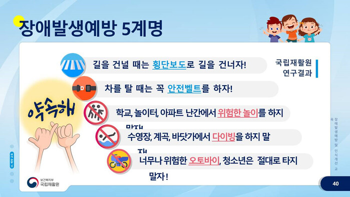 교육은 대면 방식으로 진행되며 ▲학교와 생활 속에서 일어날 수 있는 후천적 장애 발생 사례 ▲장애의 정의와 유형 ▲대한민국 장애인 현황 및 발생원인 ▲후천적 장애 발생 예방 5계명 등을 다룬다.