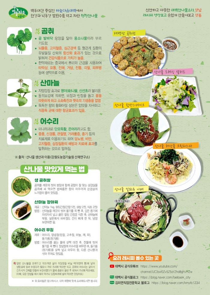 또한, 태백고원산채연구회와 산마늘연구회에서는 가정의 달을 맞이해 택배주문을 통한 50% 할인배송 행사도 같은 날 동시에 진행해 멀리 있는 가족이나 가까운 지인에게 맛과 품질이 월등한 태백산나물을 선물할 수 있는 기회를 제공할 예정이다.