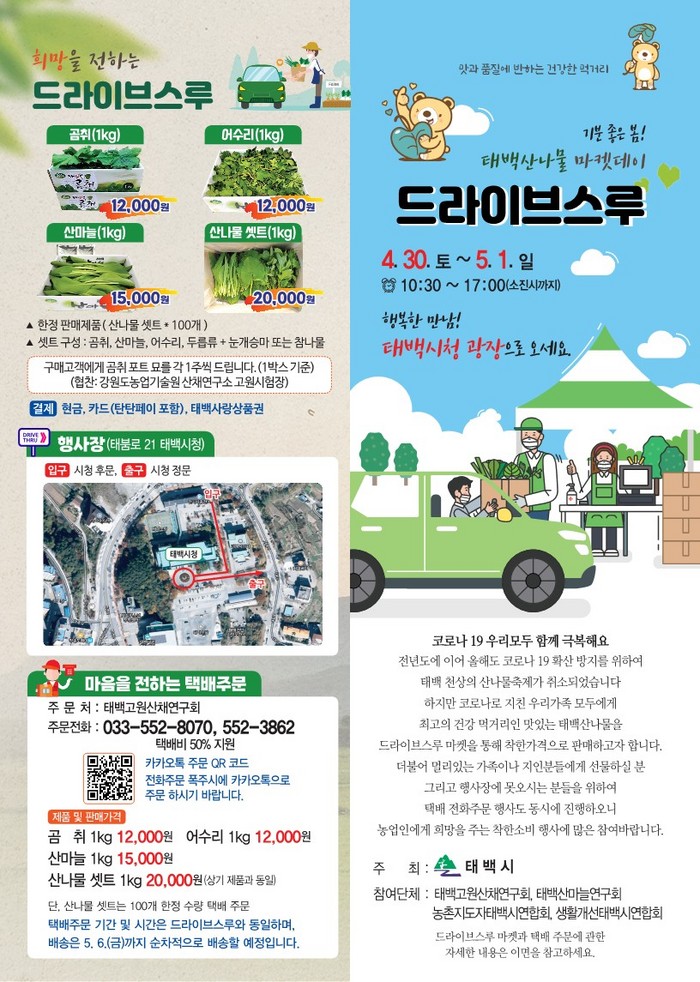 이번 행사는 전년도에 이어 올해도 코로나19 확산 방지를 위해 취소된 태백 천상의 산나물 축제를 대신해 봄철 최고의 건강 먹거리인 태백산나물을 판매해 시민들이 안전하게 구입할 수 있도록 마련됐다.