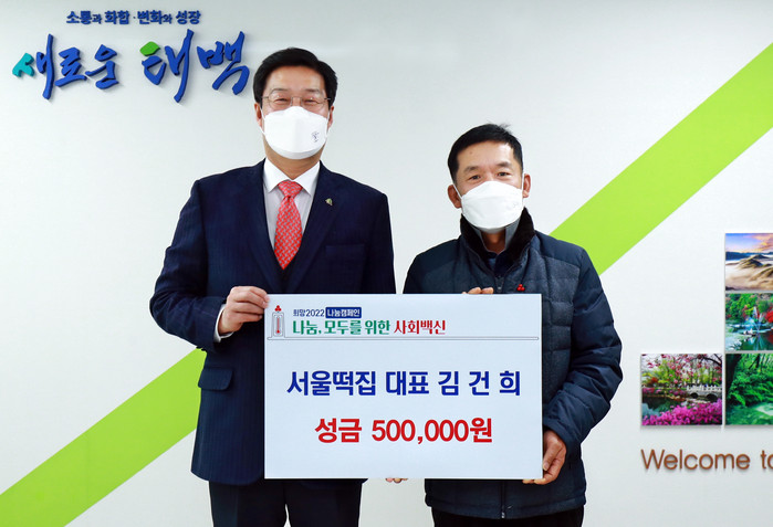[로컬세계 박상진 기자]강원 태백시 황지동 소재 서울떡집(대표 김건희)은 지난 26일 태백시청을 방문해 관내 어려운 이웃을 위한 희망 2022캠페인 이웃돕기 성금 50만원을 지정기탁 했다.