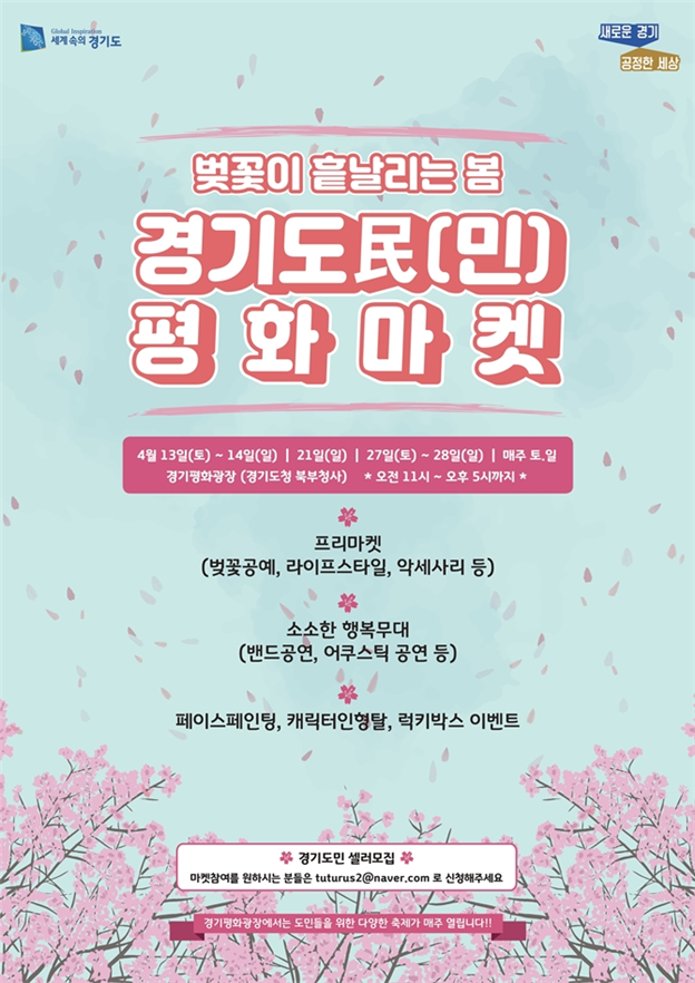 한편 ‘경기도民 평화마켓’과 ‘소(小)소(笑)한 행복무대’는 이번 4월 이후에도 올 연말까지 계획돼 있다. 5월에는 ‘가정의 달’을 맞아 ‘패밀리마켓’으로 열릴 예정이며, 셀러 참여 신청 및 자세한 일정은 (운영사 ☎ 070-4046-4958) 및 경기도로 문의하면 된다.
