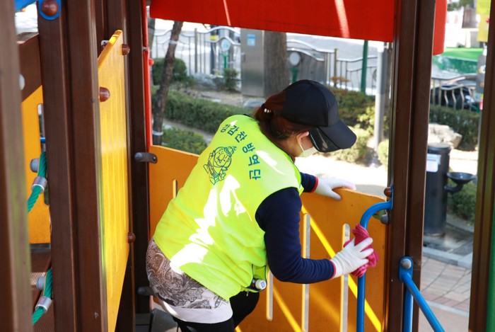 ▲어린이 공원에서 소독방역 중인 강감찬 방역단. 관악구 제공 |