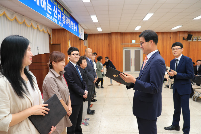 특히 이날 임용식에서는 인사발령통지서(임용장)를 신규 임용자의 부모 또는 가족에게 수여했다. 신규 임용자에게는 공직자로서 가져야 할 자세가 담긴 목민심서 관련 도서를 전달했다.