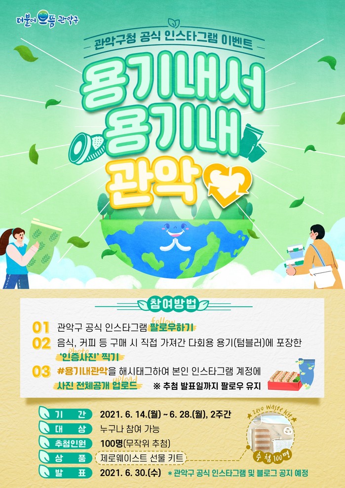 참여 방법은 상점에서 음식, 음료 등을 구입할 때 직접 가져간 다회용 용기(텀블러)에 음식을 포장한 인증사진을 찍어 인스타그램에 사진과 함께 해시태그 ‘#용기내관악’을 업로드 하면 된다.