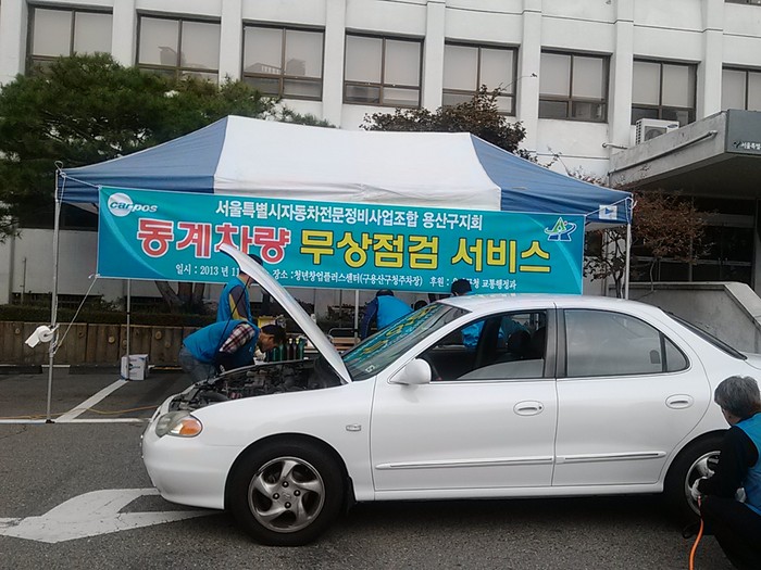 ▲지난 2013년 서울 용산구 청년창업플러스센터에서 서울시자동차전문정비사업조합 용산구지회 회원들이 무료 점검 서비스를 하고 있다. |