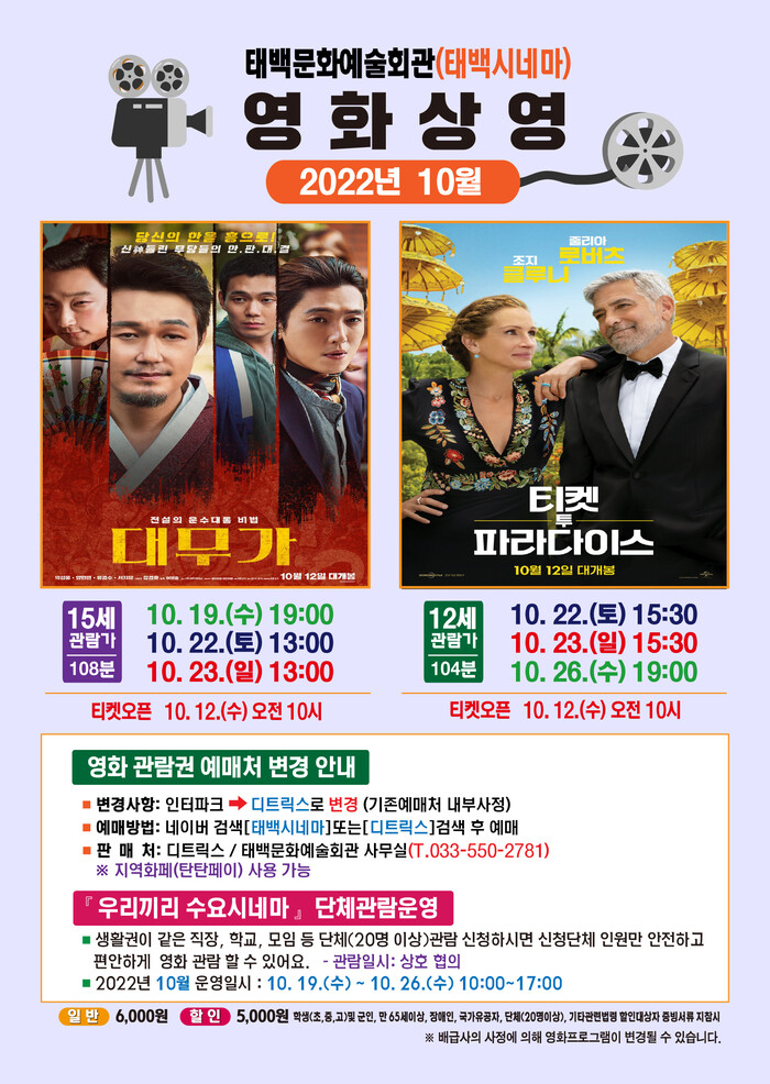 티켓 예매는 오는 12일 오전 10시부터 네이버 ‘태백 시네마’ 또는 ‘디트릭스’를 검색 후 온라인 예매가 가능하며 온라인 예매가 어려울 경우 태백문화예술회관 사무실에서도 현장 구매할 수 있다.