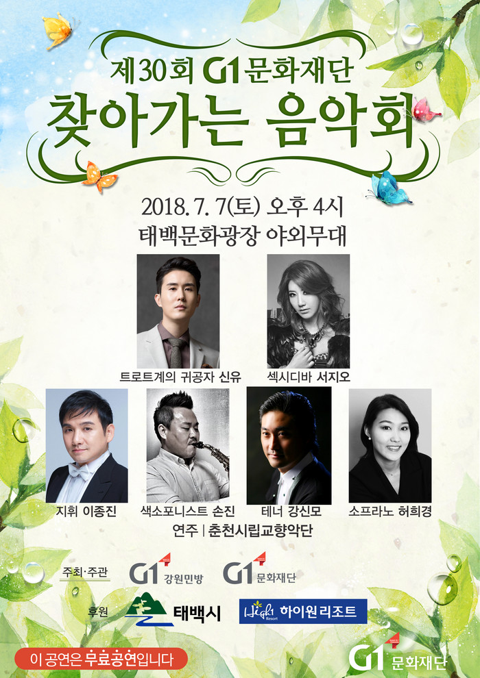[로컬세계 박상진 기자]오는 7월 7일 ‘제30회 G1문화재단 찾아가는 음악회’가 강원 태백문화광장 야외무대에서 개최된다.